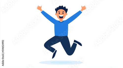 © Leninya, Fototapeta premium A joyful character is jumping with excitement, wearing a blue shirt and black pants, showcasing a vibrant and cheerful demeanor.