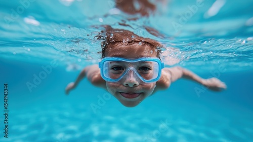 Fototapeta premium A joyful child swims underwater, exuding delight and carefree spirit,...