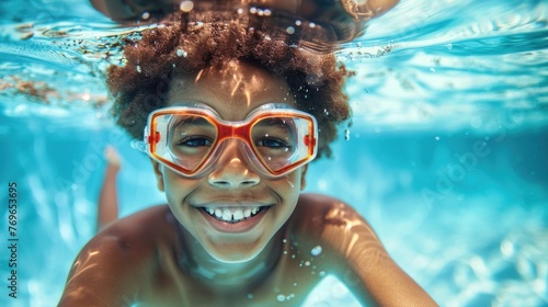 Fototapeta premium A joyful child with curly hair wearing orange goggles smiling underwater in a...