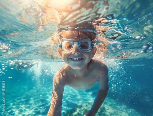 Naklejka premium A joyful child with swimming goggles enjoys an underwater adventure, capturing the essence of carefree summer fun in crystal-clear blue water, surrounded by sunlight and bubbles.