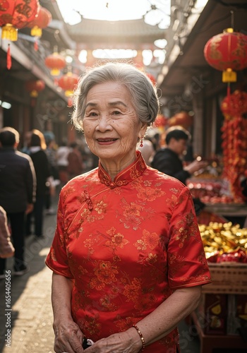 Obraz premium A Joyful Elderly Asian Woman in a Traditional Red Dress Smiling in a Bustling...