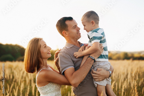 Fototapeta premium A joyful family spends time outdoors in a golden field during late afternoon. The father holds his smiling son, while the mother looks at them with affection.