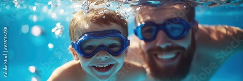 © gunzexx png and bg, Naklejka premium A joyful father and son pair with goggles swim underwater in a clear blue swimming pool, sharing a moment of laughter and bonding amid sparkling bubbles.