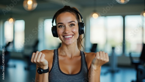 © ikhsan, Obraz premium A joyful fitness enthusiast in a gym, wearing headphones and a gray sports top, beams with enthusiasm and energy.
