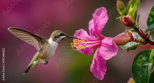 Obraz premium A joyful hummingbird feeding on nectar from a vibrant pink blossom