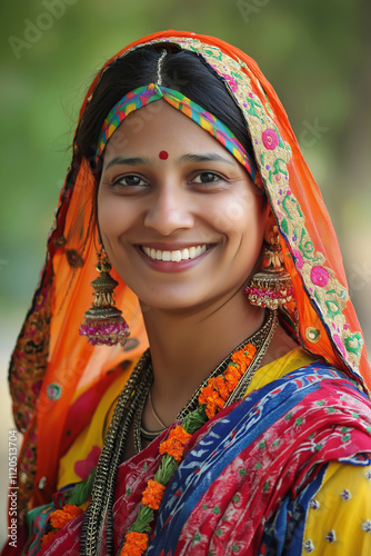 Fototapeta premium A joyful Indian woman adorned in colorful traditional attire.