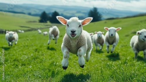 Obraz premium A joyful lamb leaps through a lush green field, surrounded by other sheep...
