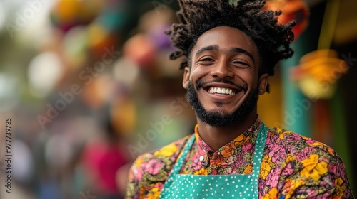© Dulemegapixel, Fototapeta premium A joyful market vendor in colorful attire with an apron smiles warmly, embodying the essence of a vibrant and engaging marketplace environment.