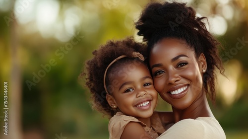 © Larisa AI, Fototapeta premium A joyful moment captured between a mother and her daughter who share a warm smile, expressing deep love and connection in a beautiful outdoor setting.