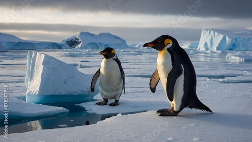 Fototapeta premium A joyful penguin couple sharing a heartwarming moment together, perhaps waddling hand in hand or exchanging affectionate gestures, surrounded by a backdrop of icy landscapes or vibrant polar .