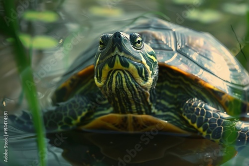 © Jennie Pavl, Obraz premium A joyful turtle soaking up the warm sunlight with a radiant expression on its face.