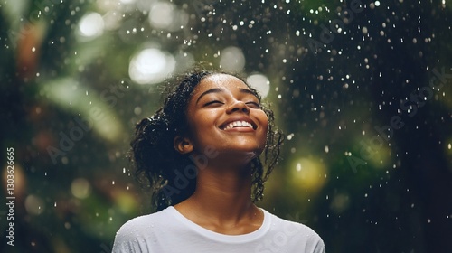© ADIFERI, Fototapeta premium A joyful woman enjoying rain in a lush, green environment.