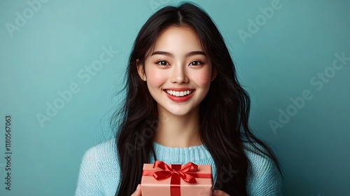 Fototapeta premium A joyful woman in a pink sweater presents a gift against a teal background, perfect for holiday cards, birthday celebrations, or promotional materials.