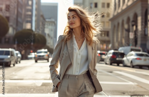 Fototapeta premium A joyful woman in a suit walks on a city street, bathed in sunlight and shadows