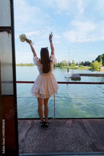 Fototapeta premium A joyful woman is celebrating by the peaceful water, holding vibrant flowers...
