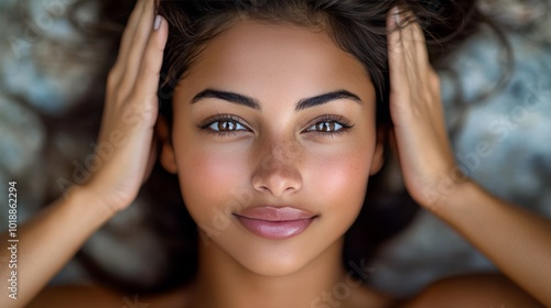 © olegganko, Fototapeta premium A joyful woman smiling brightly while relaxing on a colorful blanket indoors during daytime