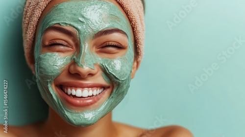 Fototapeta premium A joyful woman smiling with a green facial mask on, showcasing a refreshing beauty routine while exuding positivity and self-care in her skincare regimen.