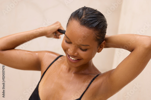 Fototapeta premium A joyful woman washes her hair, expressing a refreshing and invigorating sensation. The image captures personal care and self-indulgence, highlighting wellness and hair care routines