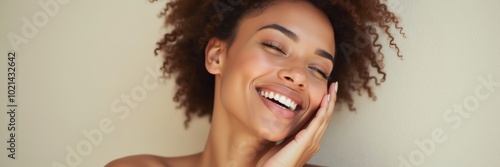 Obraz premium A joyful woman with beautiful curly hair, radiating confidence and happiness, perfect for beauty, wellness, or lifestyle marketing.