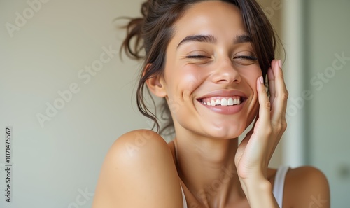Fototapeta premium A joyful young woman smiling brightly, radiating happiness and positivity, perfect for lifestyle, beauty, and wellness themes.