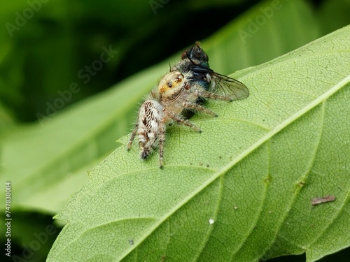 © Opayaza, Fototapeta premium a jumping spider eating a flie on the leaf