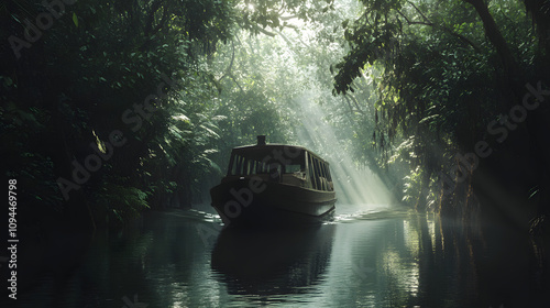 Fototapeta premium A jungle expedition boat traveling down a narrow river surrounded by dense...