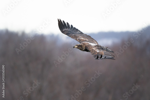 © David, Obraz premium A juvenile bald eagle soars above the trees.