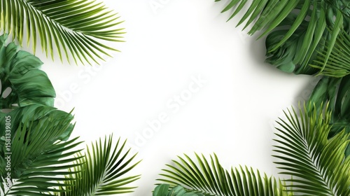 © ShahinAlam, Fototapeta premium A 4K photo of lush green tropical leaves frame a white background.