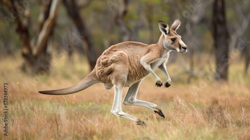 Obraz premium A kangaroo hops through the Australian outback, its powerful legs and...