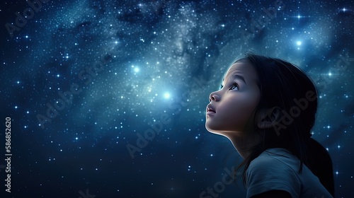Fototapeta premium a kid looking up in the starfield sky with hope and dream , imagination...