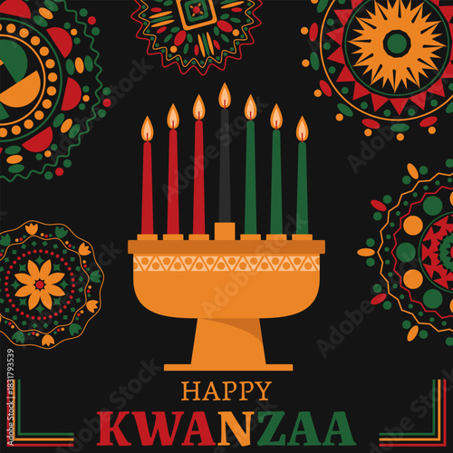 Obraz premium A kinara holds seven candles, colored red, black, and green, surrounded by festive patterns. The design celebrates Kwanzaa, highlighting cultural symbols and unity in a joyful atmosphere.