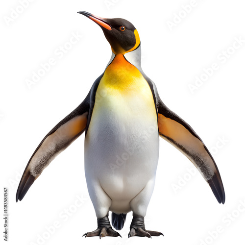 © Md. Habibur, Fototapeta premium A king penguin with vibrant yellow plumage stands with its wings slightly outstretched, looking upwards