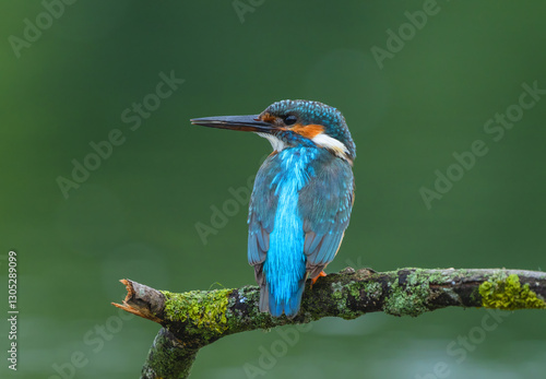 Fototapeta premium A kingfisher sits on a moss-covered branch with its bright back turned