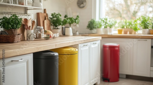 Fototapeta premium A kitchen scene with a compost bin, recycling bin, and regular trash can side...