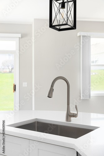 Obraz premium A kitchen sink detail with a black light hanging above the white island and...