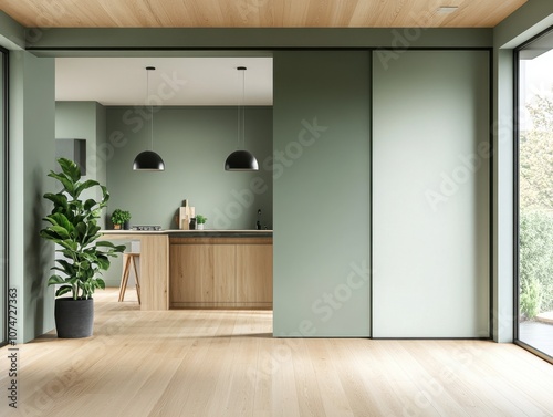 © Bouchra, Fototapeta premium A kitchen with a sliding door and a potted plant