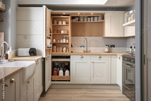 Fototapeta premium A kitchen with numerous white cupboards providing ample storage space. The modern design offers a clean and bright look to the room