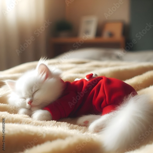 © Feni, Obraz premium a kitten is sleeping soundly on a warm thick blanket