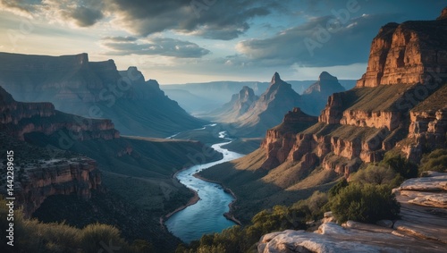 © VirtualVista, Fototapeta premium A 26 km long Canyon features the Three Rondavels on the right, three mountain peaks that look like traditional homesteads.
