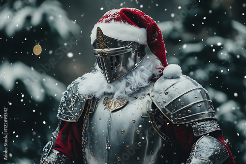 Fototapeta premium A knight in festive attire wearing a Santa hat, surrounded by a snowy...