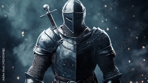 © Rstm, Fototapeta premium A knight in full armor stands with a sword in a dark, smoky environment.