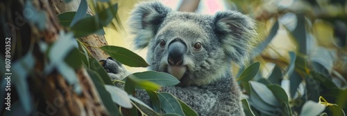 Fototapeta premium A koala bear calmly perched in a eucalyptus tree, showcasing its unique...