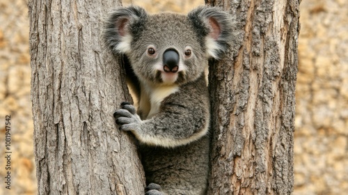 © Rere_Art151, Obraz premium A Koala Bear Peeking from Behind a Tree Trunk