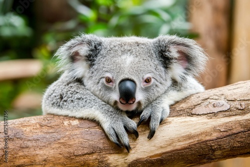 © Thanyarat, Naklejka premium A koala climbing down a tree trunk, its claws firmly gripping the bark as it makes its way to the ground