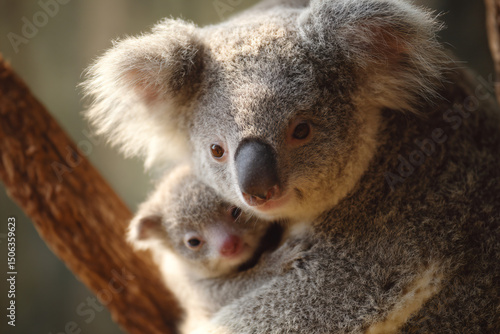 © mizmizstk, Naklejka premium a koala holding a baby in its arms