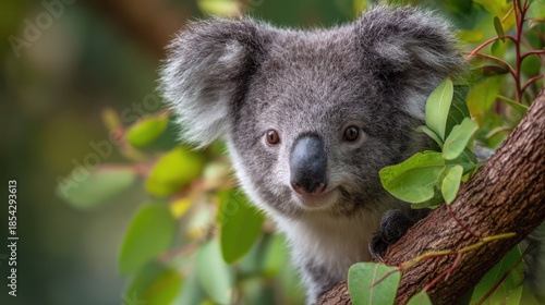 © mila103, Obraz premium A koala is seen sitting on a tree branch in an Australian forest. The koala's face is visible and vibrant green leaves surround it in the daylight. The setting is natural and lively.