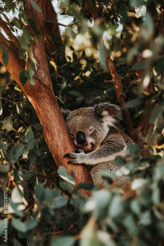 © AURA COLLECTIONS, Obraz premium A koala peacefully sleeping on a tree branch surrounded by green leaves.
