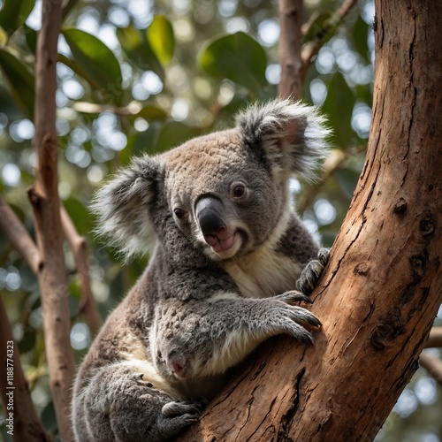 © Muhammad, Obraz premium "A koala sleeping peacefully in a tree, its body nestled against the white background.""A sleepy koala clinging to a eucalyptus tree in the Australian outback."
