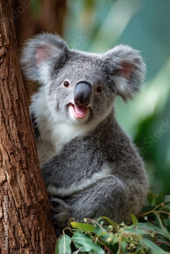© Ranti, Obraz premium A koala, with gray fur and white chest, sits happily in a tree, its mouth slightly open