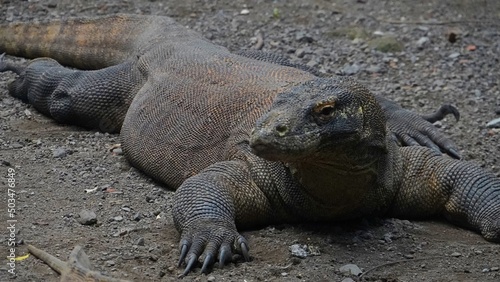 Obraz premium A Komodo dragon (Varanus komodoensis) is sunbathing before starting its daily activities